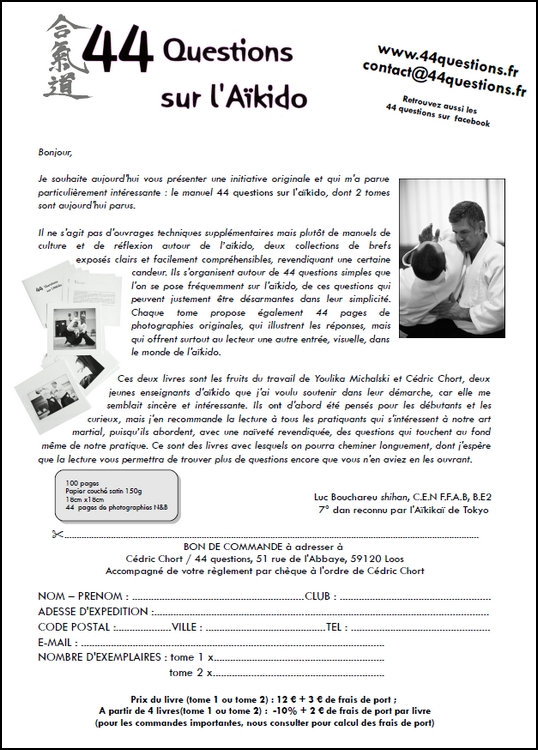 Vous pouvez commander les 2 tomes des 44 Questions sur l’aïkido à l’aide du BON DE COMMANDE, à télécharger en cliquant sur ce lien ou sur l’image ci-dessous.